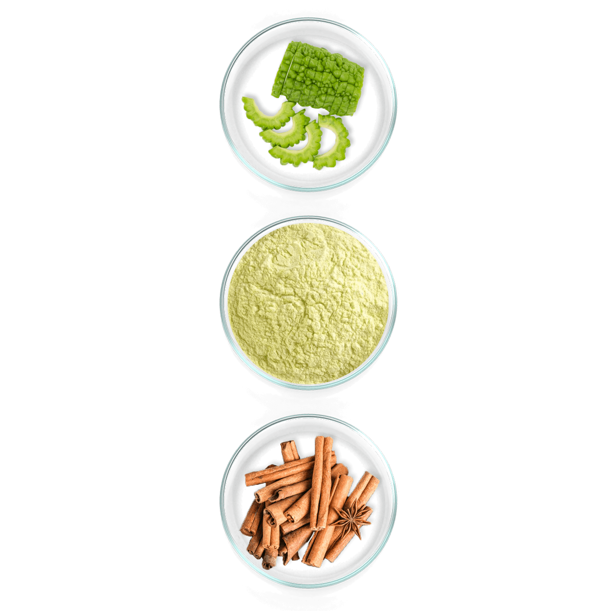 - Ekstrakt gorke dinje – ekstrakt koji se dobija iz ploda gorke dinje – karele (Momordica charantia L.) koji sadrži bioaktivna jedinjenja koja poboljšavaju efikasnost vezivanja insulina za efikasniju distribuciju glukoze u ćelijama i doprinose manjoj apsorpciji šećera iz hrane.