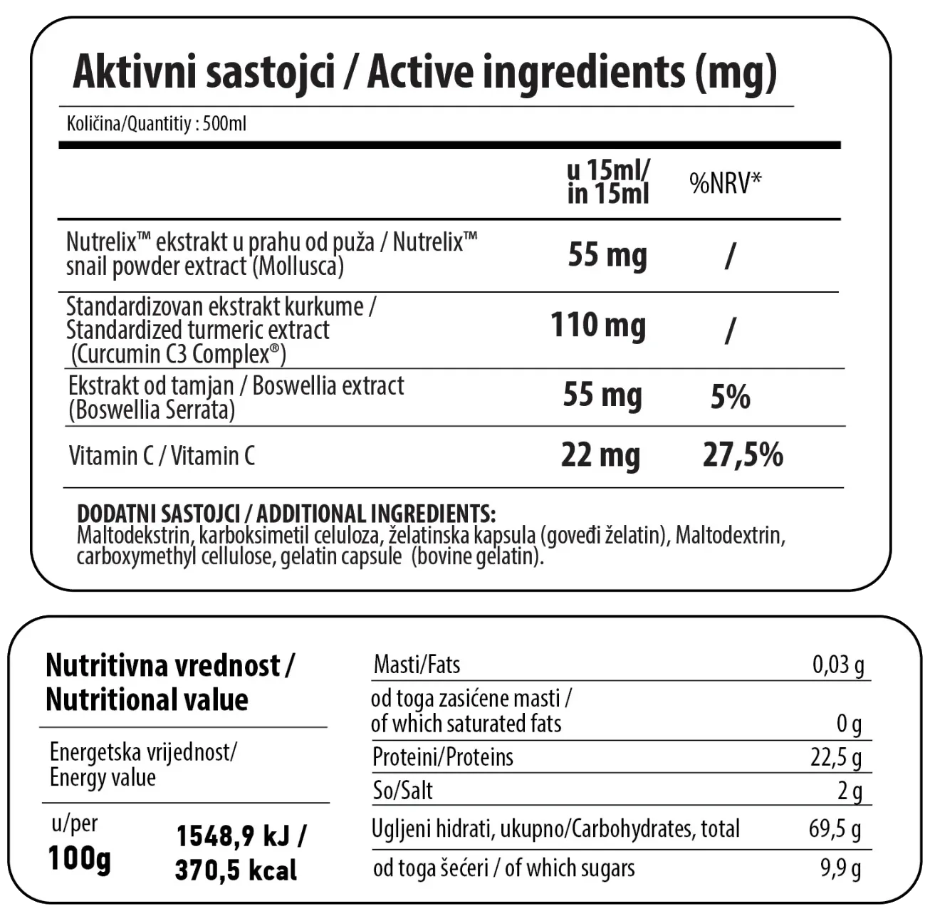 - Nutrelix® - patentirani, standardizovani ekstrakt dobijen iz sluzi puževa evropske vrste Helik Pomatia, koji sadrži alantoin, kolagen, glukozamin, glukoaminoglikan (hondroitin sulfat i hijaluronsku kiselinu) i minerale, za koji je naučno dokazano da doprinosi održavanju i poboljšanju elastičnosti , štiti i povećava otpornost hrskavice, poboljšava pokretljivost kroz pojačano lučenje sinovijalne tečnosti u zglobnoj čašici i povećanu sintezu kolagena u vezivnom tkivu tkiva. Klinička studija sprovedena na 30 ispitanika sa problemima zglobova, u periodu od 8 nedelja koji su primali 100mg Nutrelik®-a, pokazala je zadovoljstvo tretmanom kod više od 80% ispitanika koji su potvrdili da „osećaju manje bolova u zglobovima nakon tretman“. Pored toga, laboratorijska ispitivanja Nutrelik®-a su takođe pokazala da 24-časovni tretman ćelija skeletnih mišića čoveka (kMC) stimuliše sintezu kolagena u zglobovima, koji je neophodan za regeneraciju hrskavice.